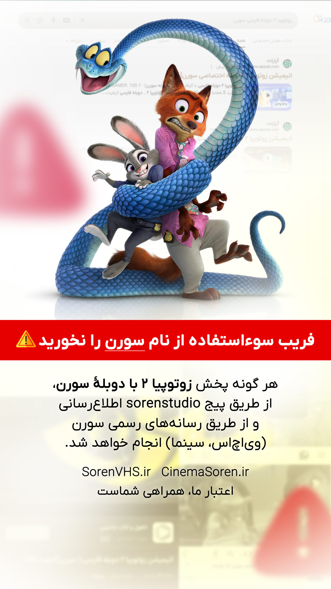 هر گونه پخش زوتوپیا ۲ با دوبلهٔ سورن، از طریق پیج sorenstudio اطلاع‌رسانی و از طریق رسانه‌های رسمی سورن (وی‌اچ‌اس، سینما) انجام خواهد شد.